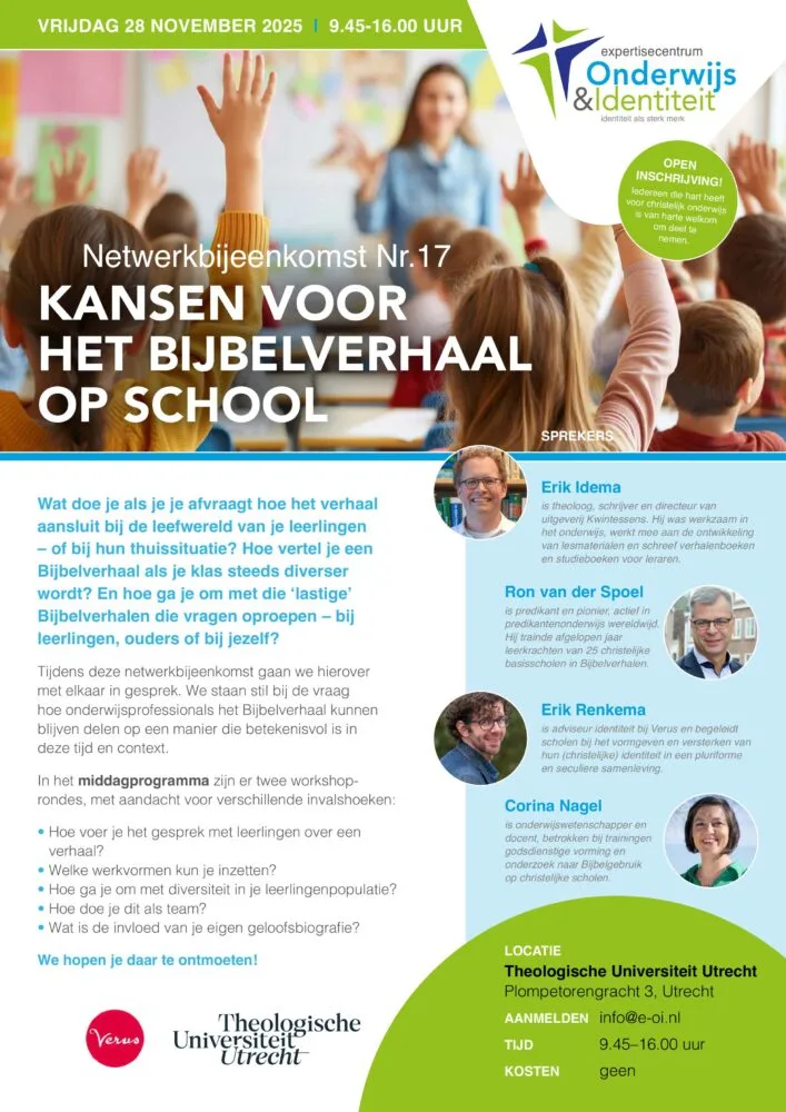 Woensdag 5 november organiseert het Nederlands Genootschap voor Godsdienstwetenschap (NGG) van 14.00 tot 15.30 uur een paneldiscussie over Nederlands levensbeschouwelijk onderwijs: een spagaat tussen religiewetenschappelijke vorming en persoonsvorming (Universiteit Utrecht, Drift 25, Utrecht). Meer informatie