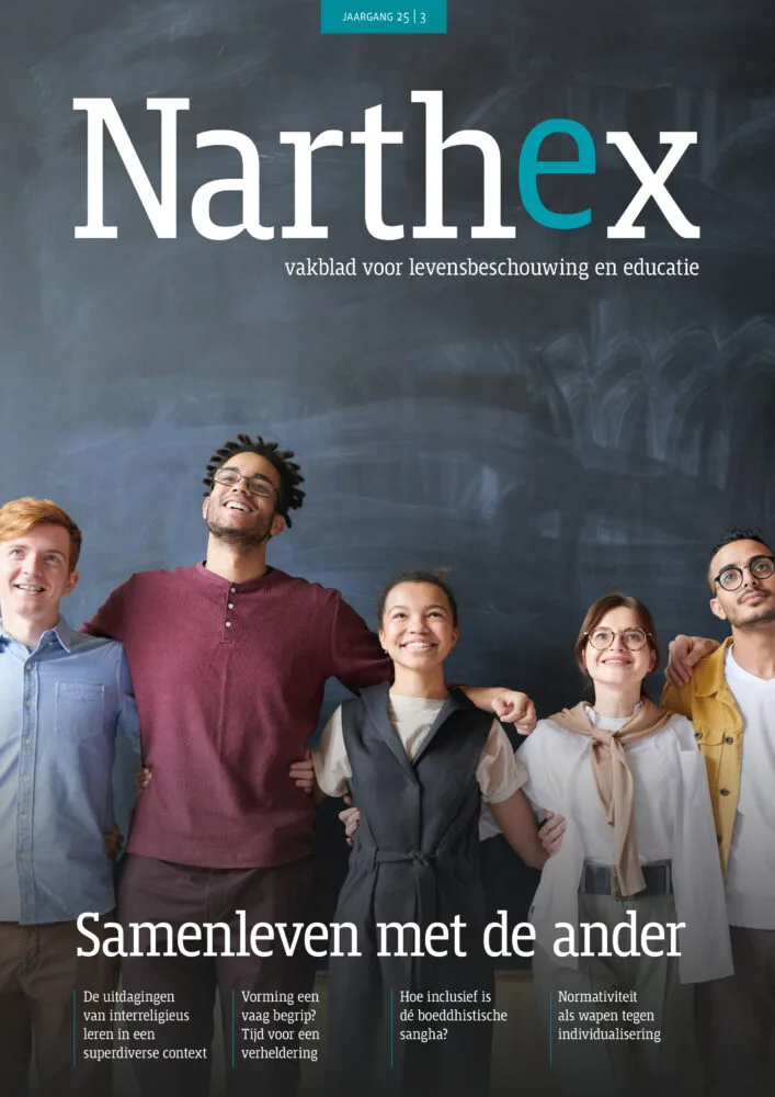 In deze Narthex is het thema: samenleven met de ander. Hoogleraar Levensbeschouwelijke vorming Cok Bakker, beschrijft in zijn artikel het spanningsveld tussen schoolidentiteit enerzijds en een superdiverse leerlingpopulatie anderzijds. De eerste interreligieuze basisschool in Ede was een poging om dit spanningsveld op te heffen, maar de school bestaat niet meer omdat het te veel weerstand opriep. De ontmoeting met de ander kan behoorlijk schuren, maar zonder wrijving geen glans.